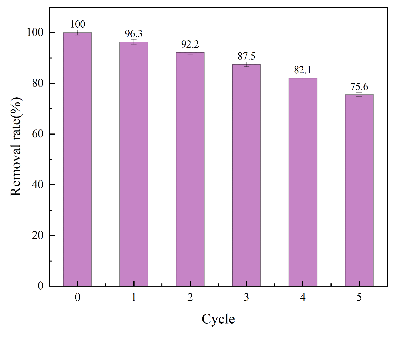 The economic viability of adsorption processes critically depends on adsorbent reusability. Cyclic adsorption–desorption experiments (five cycles; desorption: 0.1 M NaOH, 2 h; adsorption pH = 2) demonstrated robust regeneration of aminated lignin (AL), maintaining 75.6% Cr (VI) removal efficiency (