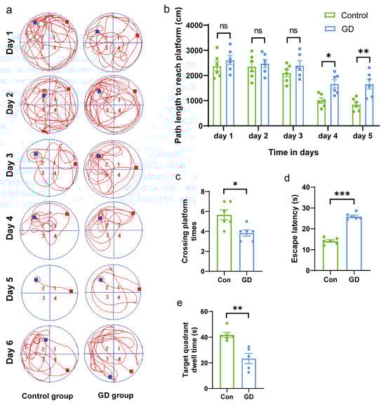 In training trials, as shown in Figure 1b, the control group showed a progressive decrease in path length to reach the platform, indicating that training trials were completely effective in the control group. Meanwhile, the GD group showed a less progressive decrease in path length to reach the platform and had a significantly longer path length to reach the platform compared to the control group on day 4 and day 5 (day 4, p < 0.05; day 5, p < 0.01). Additionally, swimming trajectories on the 1th to 5th days revealed that those in the GD group were more disorganized and purposeless compared to those in the control group.