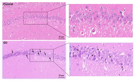 Compared with the control group by HE staining, neuronal depletion in the hippocampal CA1 region was evident with disrupted cellular alignment in the GD group (Figure 2). This finding indicates significant structural pathology in guinea pig hippocampal tissues after repeated exposure to soman.