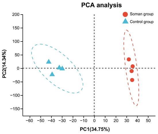 In the hippocampus of guinea pigs, a total of 4523 proteins with one or more unique peptides were identified with a false discovery rate (FDR) of <1% and quantified using tandem mass tag (TMT) technology following soman exposure. Principal component analysis (PCA) were employed to analyze and compare samples from the soman and control groups. The model quality was assessed using R2X and Q2Y parameters. The PCA results (Figure 4) indicated that R2X = 34.75% and Q2Y = 14.34%, demonstrating significant differences between the control and soman groups, with minimal variation within each group.
