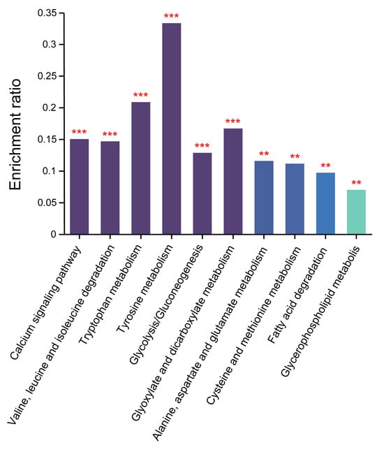 These differentially expressed proteins were analyzed based on KEGG functional enrichment with an adjusted p-value < 0.05 by Fisher’s exact test. The results showed that these differentially expressed proteins were enriched in the calcium signal pathway; valine, leucine and isoleucine degradation; tryptophan metabolism; tyrosine metabolism; glycolysis/gluconeogenesis; glyoxylate and dicarboxylate metabolism; alanine, aspartate and glutamate metabolism; cysteine and methionine metabolism; glycerophospholipid metabolism; and fatty acid degradation (Figure 5).