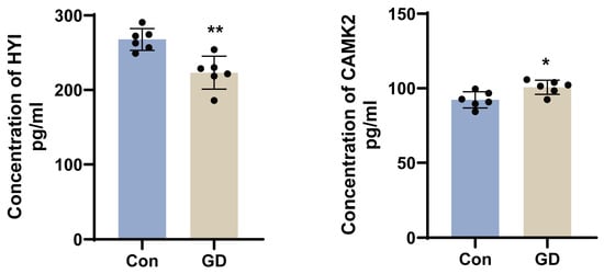 To validate the alterations of key differentially expressed proteins after subacute soman exposure, HYI and CAMK2 were representatively selected and subjected to ELISA (Figure 6). Hippocampus samples from six guinea pigs in the soman group and six guinea pigs in the control group were tested for protein expression. As a result, the abundance of CAMK2 increased (p < 0.05) in the hippocampus with 11.0 μg/kg of soman treatment. In addition, the abundance of HYI decreased (p < 0.01) in the hippocampus. These results were consistent with those obtained from LC–MS/MS.
