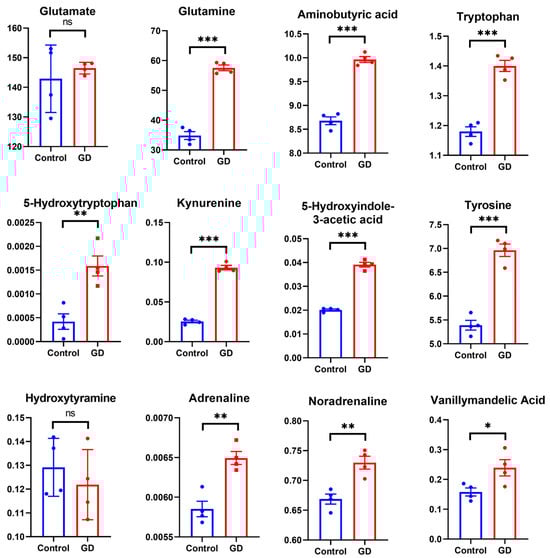 In the alanine, aspartate, and glutamate metabolism, ABAT and ALDH5A1 were downregulated, suggesting that soman induces the impairment of alanine, aspartate, and glutamate metabolism. Glutamine and GABA (Figure 7), key intermediate metabolites in alanine, aspartate, and glutamate metabolism, were significant elevated following soman exposure relative to the control group. This disruption likely contributes to the neuronal hyperexcitability observed following soman exposure [].