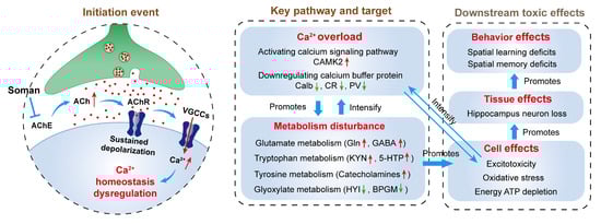 This study establishes that soman-induced hippocampal damage extends beyond acute cholinergic crisis to involve multi-pathway metabolic dysregulation. Through calcium-mediated disruption of interconnected metabolic networks—glyoxylate/dicarboxylate, tryptophan, tyrosine, and glutamate pathways—soman triggers a self-sustaining cycle of energy failure, excitotoxicity, and oxidative stress that culminates in neuronal loss and cognitive impairment. The key molecular events include CAMK2 upregulation, HYI downregulation, and the accumulation of neurotoxic metabolites (kynurenine, catecholamines, and glutamine). These findings reposition organophosphate neurotoxicity as a metabolic disorder with secondary excitotoxic components, suggesting that therapeutic strategies targeting metabolic recovery—calcium buffering, alternative energy substrates, and kynurenine pathway inhibition—may prove more effective than solely addressing cholinergic symptoms (Figure 8). Future work should validate these targets in chronic recovery models and assess their translational potential for mitigating the long-term neuropsychiatric sequelae of OPNA exposure.