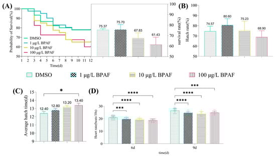 Effect of BPAF exposure on embryo-larval survival (A), hatching (B,C), and heart rate ((D), 6d N = 30; 9d N = 20) in marine medaka. Compared to the control, statistically signiffcant differences are shown with asterisks (* p ≤ 0.05, *** p ≤ 0.001, **** p ≤ 0.0001).