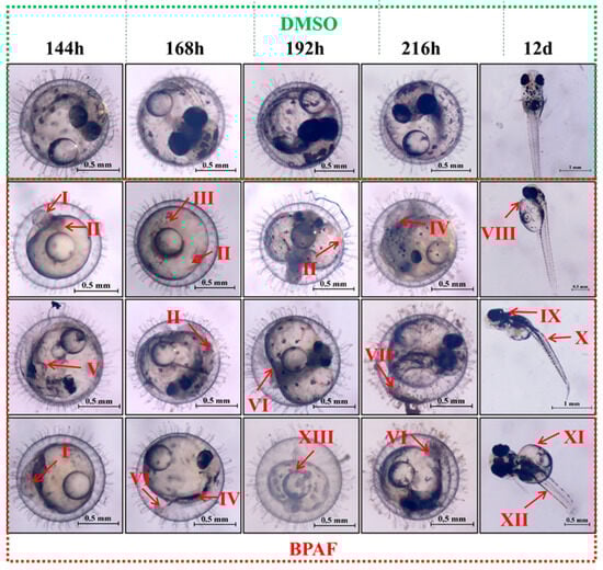 Effect of BPAF exposure on embryonic developmental morphology in marine medaka. I: eye dysplasia (lack of melanin in the eyes); II: cardiovascular bleeding; III: overall dysplasia; IV: truncal dysplasia and insufficient melanin pigmentation; V: overall deformity; VI: curved tail; VII: tail bleeding; VIII: cardiac edema; IX: craniofacial dysplasia; X: curvature of notochord; XI: yolk sac cysts; XII: short body length; XIII: abnormal yolk sac.