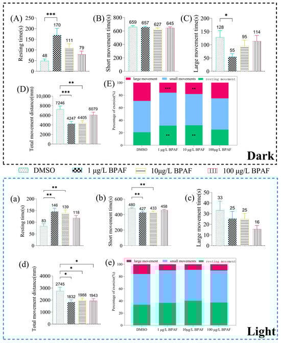 BPAF exposure significantly impaired swimming behavior in newly hatched marine medaka larvae. Under dark conditions, both 1 and 10 µg/L BPAF reduced total movement distance (Figure 4D). Specifically, 1 µg/L BPAF increased resting time (Figure 4A) and decreased large movement time (Figure 4C). Furthermore, these concentrations elevated the proportion of resting episodes while reducing large movement episodes compared to the control (Figure 4a). Under light conditions, 1 µg/L BPAF, 10 µg/L BPAF, and 100 µg/L BPAF all significantly reduced the total movement distance of the larvae (Figure 4d), and compared with the control group, 1 µg/L BPAF and 10 µg/L BPAF significantly increased the time that the larvae were in the resting time (Figure 4a), decreased the time that the larvae were in the small movement time (Figure 4b); there was no significant difference between the groups in terms of type of movement (Figure 4e).