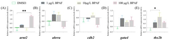 Based on the phenotype of BPAF-induced reduction in heart rate in newly hatched marine medaka larvae, this study evaluated the expression levels of cardiac development-related genes. In newly hatched larvae, exposure to 10 µg/L BPAF significantly increased the expression level of tbx2b compared to the control group (Figure 5E), while 100 µg/L BPAF exposure significantly upregulated arnt2 expression (Figure 5A).
