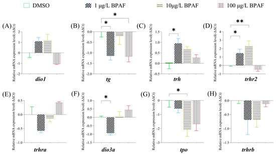 BPAF exposure disrupted the expression of HPT axis-related genes in marine medaka larvae. In newly hatched larvae, 1 µg/L BPAF significantly downregulated tg (Figure 6B) and dio3a (Figure 6F) while upregulating trh (Figure 6C) and trhr2 (Figure 6D); 10 µg/L BPAF upregulated trhr2 (Figure 6D) but downregulated tpo (Figure 6G); 100 µg/L BPAF selectively reduced tg expression (Figure 6B).