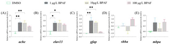 Given the observed BPAF-induced hypoactivity in swimming behavior, this study assessed changes in expression levels of selected nervous system-related genes. In newly hatched larvae, ache expression was significantly elevated in the 1 µg/L and 10 µg/L BPAF groups compared to controls (Figure 7A); both 1 µg/L and 10 µg/L BPAF significantly upregulated elavl3 (Figure 7B) and gfap (Figure 7C).