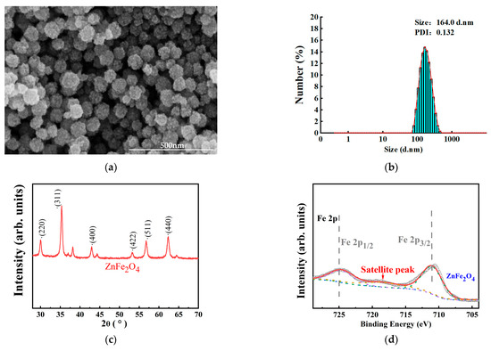 ZnFe2O4-NPs were synthesized using the hydrothermal method. A mixture of 1.983 mmol of FeCl3·6H2O, 0.992 mmol of ZnCl2, 8.925 mmol of polyvinylpyrrolidone (PVP, K = 30), and 29.75 mmol of CH3COONa was combined in 35 mL of ethylene glycol and stirred magnetically for 4 h to ensure complete dissolution of the components. All these chemicals were obtained from Sinopharm Chemical Reagent Co., Ltd., Shanghai, China. Subsequently, the solution was transferred to a 50 mL Teflon-lined autoclave (Zhengzhou Keda Machinery Company, Zhengzhou, China), heated to 180 °C for 1 h, and then heated to 200 °C for 8 h. The resulting mixture was washed with deionized water and ethanol (Analytical Reagent, Sinopharm Chemical Reagent Co., Ltd., Shanghai, China). Finally, the sample was vacuum-dried at 40 °C for 12 h to obtain the ZnFe2O4-NPs. The residual pressure during vacuum drying was maintained below 133 Pa.