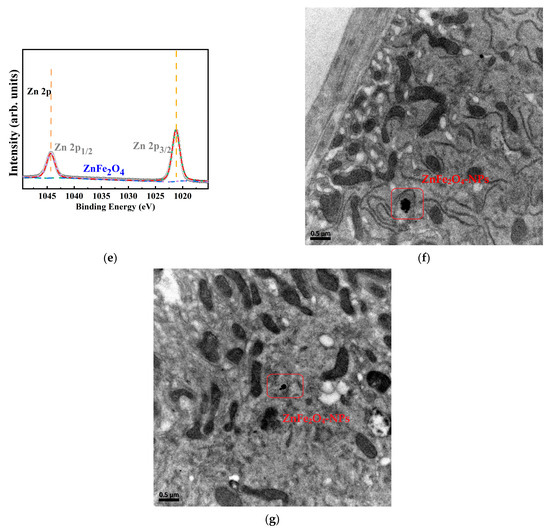 Morphological analysis by SEM revealed monodisperse spherical particles with an average diameter of approximately 100 nm (Figure 1a). The particle size distribution was further quantified showing a measured value of 164.0 d.nm (Figure 1b). The diffraction peaks observed at 2θ angles of 29.9°, 35.3°, 42.9°, 53.2°, 56.7°, and 62.2° were indexed to the planes (220), (311), (400), (422), (511), and (440), respectively (Figure 1c). The pattern was consistent with the ZnFe2O4-NPs spinel structure as per PDF card # 79-1150. Additionally, the XPS spectra of Fe(2p) and Zn(2p) were detected. The peaks at 711.7 eV (Fe 2p3/2) and 725.4 eV (Fe 2p1/2) confirmed Fe3+ in the crystal structure, and peaks at 1021.51 eV (Zn2p3/2) and 1044.66 eV (Zn 2p1/2) indicated the Zn2+ state in the spinel structure (Figure 1d,e). TEM analysis demonstrated that internalization of ZnFe2O4-NPs through the flies’ intestinal barrier was observed (Figure 1f,g).