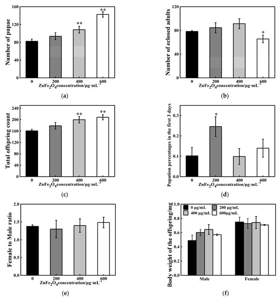 After 3 days of exposure, the parental flies were removed from mating vials and the number of offspring surviving to pupal and adult life-stages was counted. Analysis of total offspring production revealed that ZnFe2O4-NPs exposure can significantly increase numbers of offspring, with the most pronounced effects observed at higher concentrations (Figure 2a–c). Total pupation counts were elevated by 32% and 73% after 400 μg/mL and 600 μg/mL ZnFe2O4-NPs exposure, respectively (** p < 0.01, Figure 2a). Under 200 μg/mL ZnFe2O4-NPs exposure, pupation rates within the first 3 days were accelerated by 141% (* p < 0.05, Figure 2c). For eclosion development, 600 μg/mL ZnFe2O4-NPs exposure induced a 16% reduction in the number of eclosed adults (* p < 0.05, Figure 2b). No significant differences in female-to-male ratio or body weight of offspring were observed under ZnFe2O4-NPs exposure (Figure 2e,f).