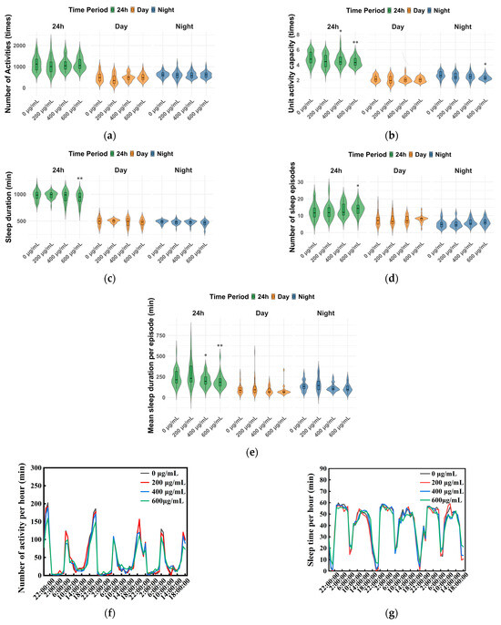 The activity results showed that for male flies after ZnFe2O4-NPs exposure, decreased unit activity capacity was observed while there were no statistically significant changes in the number of activities (Figure 3a,b). High concentrations of ZnFe2O4-NPs may induce less unit activity times. The 400 μg/mL ZnFe2O4-NPs group exhibited 6% decreases in unit activity capacity in 24 h, and the 600 μg/mL ZnFe2O4-NPs group exhibited 12% and 10% decreases in unit activity capacity in night and 24 h, respectively (* p < 0.05, ** p < 0.01, Figure 3b). For sleep patterns, decreased sleep duration (5%, ** p < 0.01), increased number of sleep episodes (13%, * p < 0.01), and decreased mean sleep duration per episode (20%, ** p < 0.01) were found under 600 μg/mL ZnFe2O4-NPs exposure (Figure 3c–e). In addition, no significant changes were observed except a 15% reduction in mean sleep duration per episode under 400 μg/mL ZnFe2O4-NPs exposure (Figure 3e, * p < 0.05). Three-day recording data showed that the exposure groups exhibited similar activity and sleep rhythms as the control groups (0 μg/mL), regardless of concentrations of ZnFe2O4-NPs (Figure 3f,g), with an activity peak and a sleep trough at ~6:00 and 18:00, the same as the set light/dark cycles (12 h/12 h, light-on time set at 6:00 AM every day, GMT + 6:00).