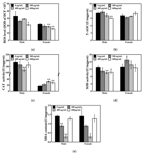 The offspring flies were selected and examined after 24 h post-eclosion. The effects of ZnFe2O4-NPs on oxidative stress responses differ between sexes. ROS levels in vivo decreased by 36% in male flies after 600 μg/mL ZnFe2O4-NPs exposure, while 16% and 29% reduction in ROS contents in females were found, respectively, after 400 μg/mL and 600 μg/mL ZnFe2O4-NPs exposure (* p < 0.05, ** p < 0.01, Figure 4a). For determination of the antioxidant system, T-AOC suppression was found in males flies (11% and 19% under 400 and 600 μg/mL ZnFe2O4-NPs exposure, respectively), but no significant changes were observed in female flies (Figure 4b). Specifically, ZnFe2O4-NPs weakened the CAT and SOD enzyme activities of male flies, accompanied with depressed MDA levels (* p < 0.05, ** p < 0.01, Figure 4c–e). Concurrently, the female flies exhibited upregulated CAT and SOD enzyme activities under ZnFe2O4-NPs exposure, accompanied with the reduction in MDA contents (* p < 0.05, ** p < 0.01, Figure 4c–e).