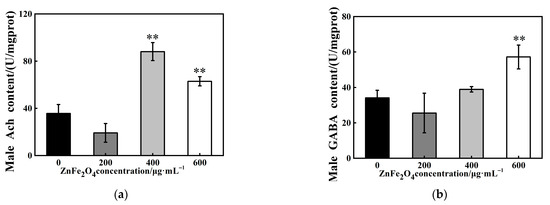 To investigate the mechanisms of rhythmic alterations, we examined the neurotransmitter levels in vivo of F1 male flies after ZnFe2O4-NPs exposure. The results showed that ACh contents were elevated by 147% and 77% under 400 and 600 μg/mL exposure, respectively (** p < 0.01, Figure 5a). In parallel, the 600 μg/mL dose exposure induced a 68% upregulation of GABA (** p < 0.01, Figure 5b).