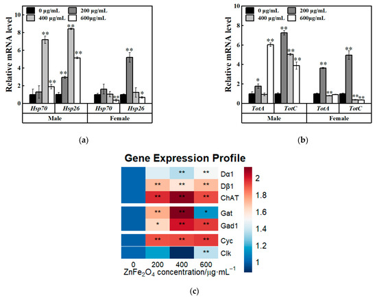 To further elucidate the mechanisms of ZnFe2O4-NPs exposure in insects, relative expression levels of heat shock protein encoding genes (Hsp70, Hsp26) and Turandot family genes (TotA, TotC) were investigated. TotA is a stress-responsive peptide coordinating trade-offs between immunity and reproduction, while TotC can mediate metabolic adaptation to nutrient deprivation in D. melanogaster [35,36]. In F1 males, significant upregulated relative expression levels of Hsp70, Hsp26, TotA and TotC genes were detected (* p < 0.05; ** p < 0.01, Figure 6a,b). However, downregulated relative expression levels of Hsp70 and Hsp26 were found in F1 females (at 600 μg/mL ZnFe2O4-NPs exposure, * p < 0.05; ** p < 0.01, Figure 6a), although relative expression levels of Hsp26 was increased under 200 μg/mL exposure (** p < 0.01, Figure 6a). For Turandot family genes, the F1 females exhibited increased relative expressions at 200 μg/mL exposure but decreased gene expressions at 600 μg/mL (** p < 0.01, Figure 6b), which indicated that stress adaptation to ZnFe2O4-NPs exposure differed between sexes.