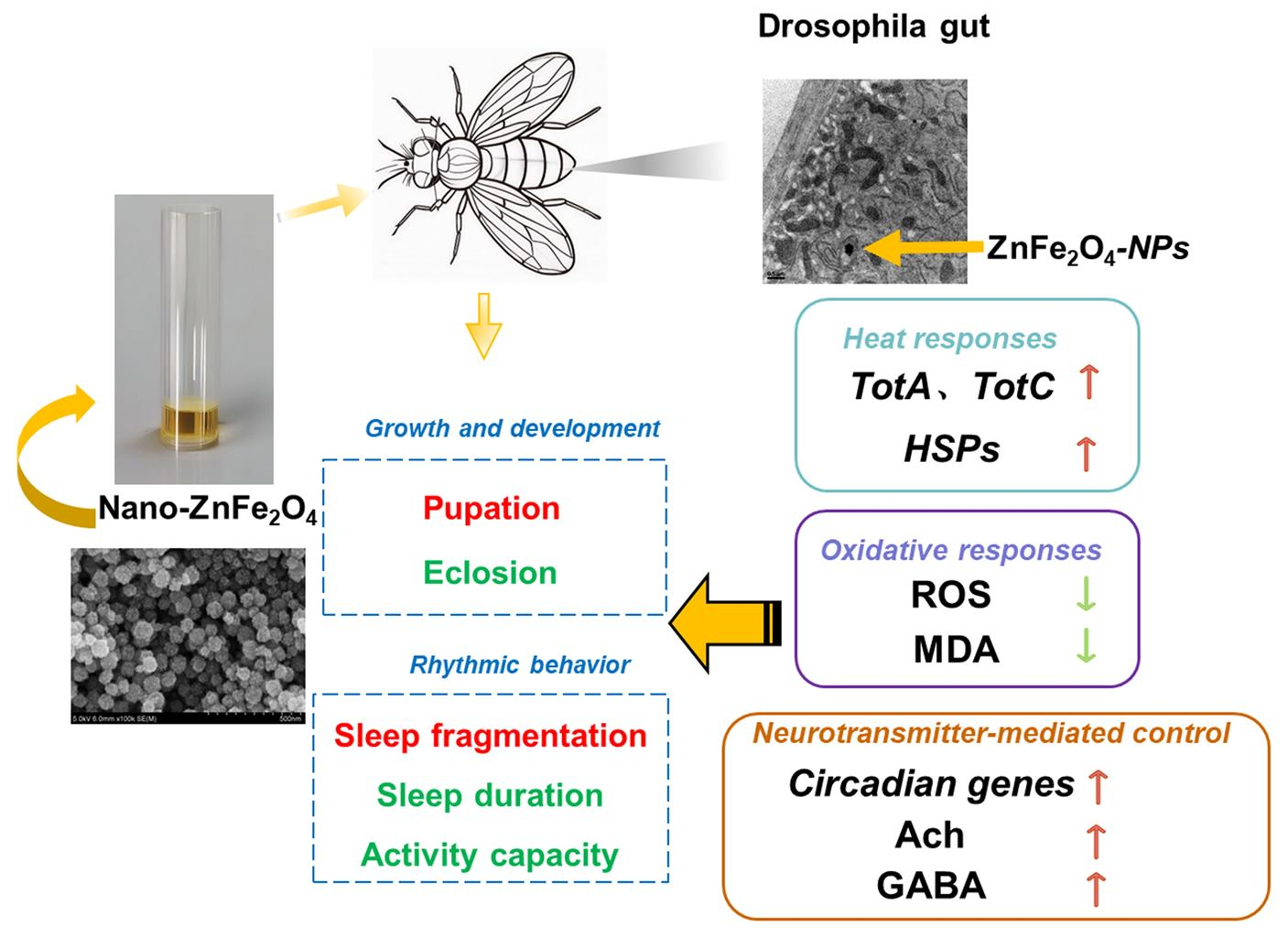 Yan, W.; Guo, Y.; Li, P.; Zhang, Z.; Yang, J.; Sun, Y. Effects of ZnFe2O4 Nanoparticles on Development and Rhythmic Behavior of Drosophila melanogaster. Toxics 2025, 13, 779. https://doi.org/10.3390/toxics13090779