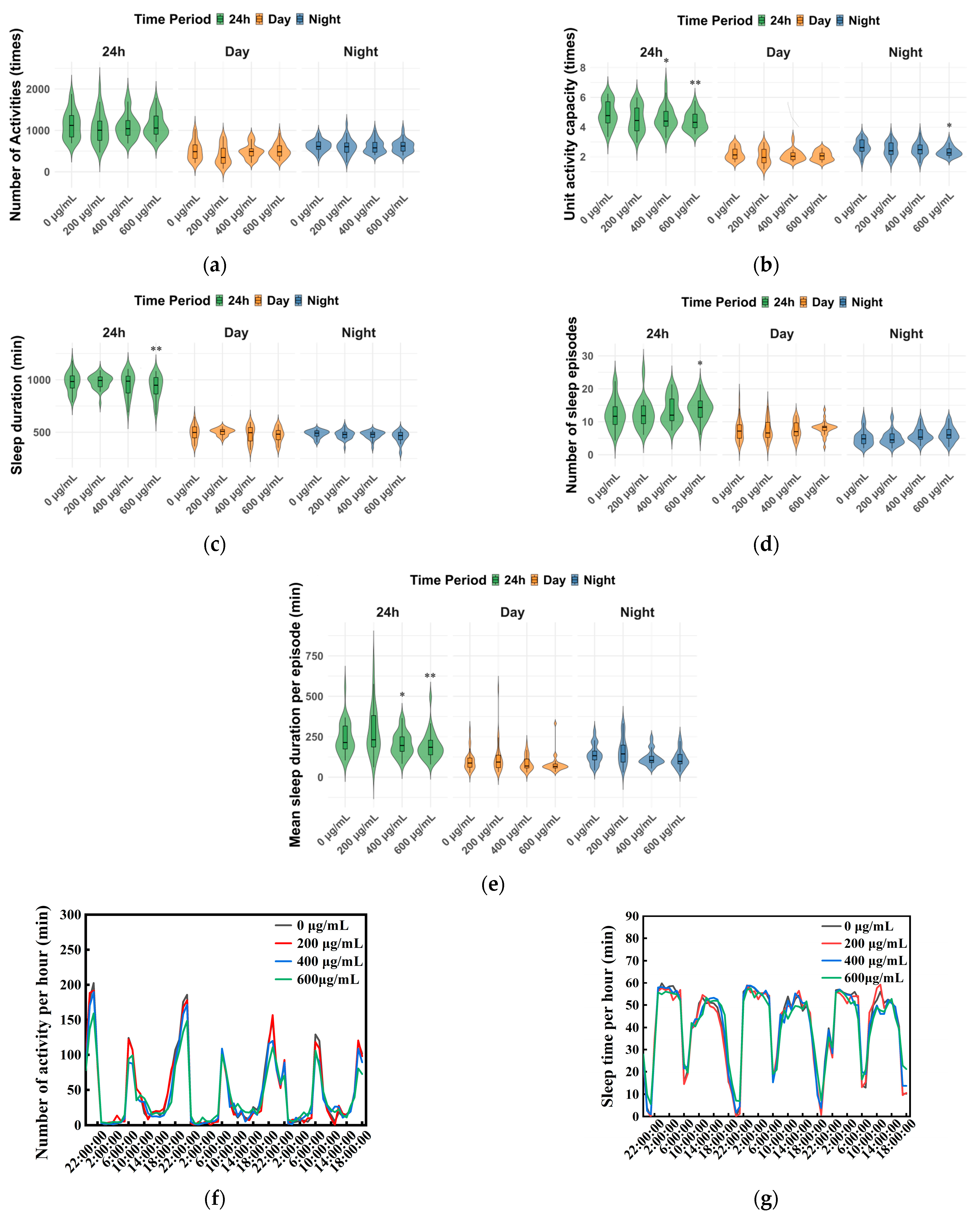 3.3. Effects of ZnFe2O4-NPs Exposure on Rhythmic Behaviors