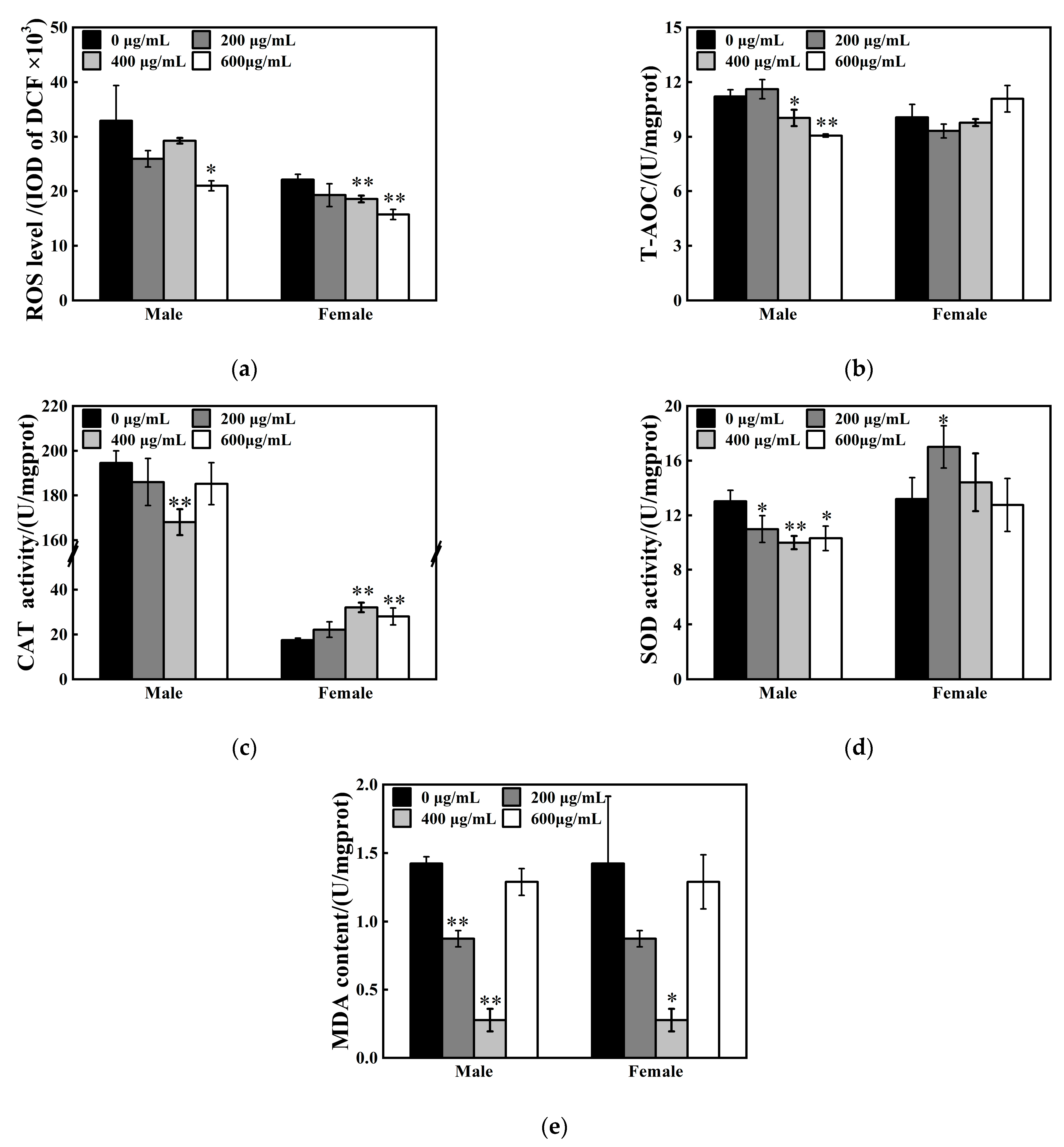 - Musachio, E.A.S.; Poetini, M.R.; Janner, D.E.; Meichtry, L.B.; Poleto, K.H.; Fernandes, E.J.; Guerra, G.P.; Prigol, M. Sex-specific changes in oxidative stress parameters and longevity produced by Bisphenol F and S compared to Bisphenol A in Drosophila melanogaster. Comp. Biochem. Physiol. Part C Toxicol. Pharmacol. 2022, 257, 109329. [Google Scholar] [CrossRef] [PubMed]