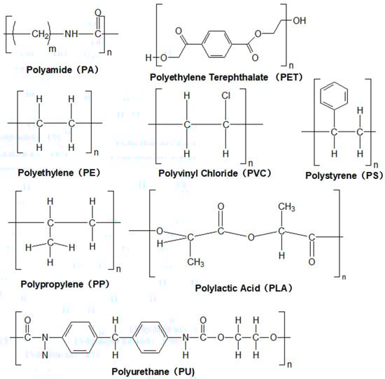 MPs are fundamentally composed of polymeric matrices characterized by diverse and intricate structures. These polymers are formed through the covalent bonding of monomeric units into linear or cross-linked polymeric chains. Variations in polymer types—such as polyethylene (PE), polypropylene (PP), and others—dictate their distinct physicochemical properties, which in turn govern their environmental behavior and fate. Representative structural configurations of common MP polymers are illustrated in Figure 1.