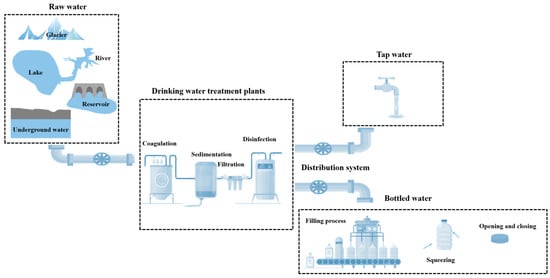 This study presents the current research on MPs in drinking water supply chains, encompassing their sources, fates, removal technologies, detection methods, and potential hazards to human health. MPs in drinking water systems exhibit multi-source input characteristics, originating from environmental infiltration into water sources; leaching from materials in water distribution systems; migration from bottled water packaging interfaces; and re-release during water treatment processes. These pathways collectively contribute to contamination across the entire supply chain, from raw water to end-user consumption. It is noteworthy that current detection technologies are limited by non-standardized sampling procedures and the limitations of identification methods, leading to the questionable comparability of data across different studies. There is an urgent need to establish standardized detection protocols that include quality control systems and to construct a multidimensional detection system through the integration of various technologies. The potential hazards of MPs remain a critical concern. Future work needs to integrate research from environmental science, toxicology, and public health to clarify the dose–effect relationships of MPs, improve risk assessment systems, and promote technological innovation and policy regulation to effectively ensure drinking water safety and public health.