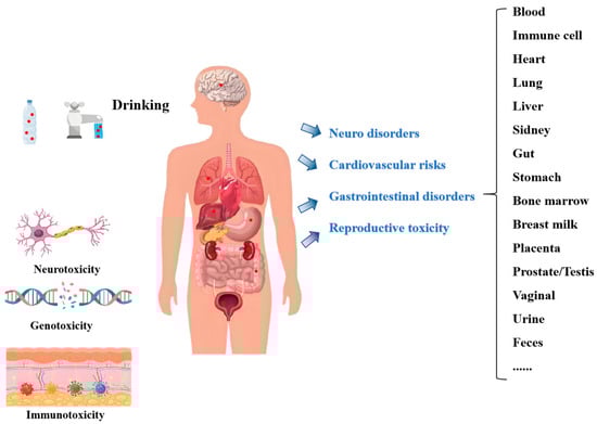 Records of MPs in drinking water are constantly being expanded and updated, which serves as a critical pathway for human exposure to these contaminants. Senathirajah et al. [] synthesized data from 59 studies to evaluate human’s MP intake, revealing an average annual ingestion of 9029~174,959 MP/L per person via drinking water, which is equivalent to a mass of 25.3–489.7 g, with a mean value of 257.5 g. Bottled water, often perceived as a “safer” alternative, has also been found to contain MPs, influenced by packaging materials, production processes, and storage conditions [,,]. The European Food Safety Authority posits that MPs larger than 150 μm are unlikely to be absorbed by the human body, while those smaller than 1.5 μm can penetrate organs []. Recent studies demonstrate that MPs can traverse biological barriers, infiltrating multiple physiological systems, including the digestive system [], circulatory system [], excretory system [], and maternal–fetal interfaces []. Notably, MPs have recently been identified in human bone marrow []. Although the long-term health implications remain unclear, emerging evidence suggests potential adverse effects on human health.