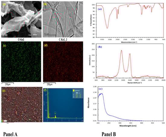 (Panel A) Morphological characterization of the prepared graphene oxide: (a) SEM image, (b) TEM image, (c) mapping image of oxygen, (d) mapping image of carbon, (e) combined mapping image of carbon and oxygen of graphene oxide, (f) EDX analysis of graphene oxide. (Panel B) Structural characterization of the prepared graphene oxide: (a) FT-IR spectrum of graphene oxide; (b) Raman spectrum of graphene oxide; (c) UV-Vis absorption spectrum of graphene oxide.