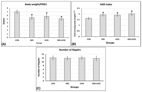 Perinatal and lactation treatment with arsenite and/or graphene oxide at PND 1 showed a significant reduction in body weight compared to the controls (p ≤ 0.05; Figure 3A). The relative anogenital distance (AGD) at PND 1 significantly increased in the female offspring exposed in utero and lactation to ARS, GOX, or ARS + GOX compared with the control group (p ≤ 0.05; Figure 3B). On PND 15, no significant changes were estimated between the arsenite- and/or graphene oxide-exposed groups and the control group in the number of teats (nipples of the mammary glands) or areolae (p ≤ 0.05; Figure 3C).