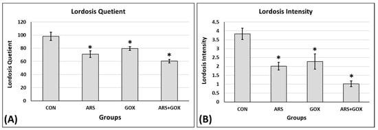 The ARS, GOX, and ARS + GOX cycling female rat offspring at proestrus presented significant decreases in mean lordosis frequency to 28%, 19%, and 39%, respectively, compared with the 98% frequency of lordosis of the control female offspring. Similarly, the lordosis intensity of the females that responded to the mounting of experienced stud males was decreased to 48%, 41%, and 73% for ARS, GOX, and ARS + GOX cycling female offspring, respectively, compared with the 4.25% intensity of lordosis of the control cycling female offspring (Figure 5). The combined ARS and GOX group showed an increase in the percentage of inhibition of reflex magnitude of lordosis, reflex magnitude 1, and reflex magnitude 2 for ARS and GOX alone, compared to a higher percentage of reflex magnitude 4 for the control (Figure 5).