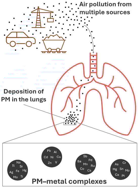 A diversity of metals and semimetals is found bound to PM, including aluminum (Al), antimony (Sb), arsenic (As), barium (Ba), cadmium (Cd), calcium (Ca), cesium (Cs), chromium (Cr), cobalt (Co), copper (Cu), iron (Fe), lead (Pb), magnesium (Mg), manganese (Mn), mercury (Hg), molybdenum (Mo), nickel (Ni), palladium (Pd), platinum (Pt), potassium (K), ruthenium (Ru), silver (Ag), sodium (Na), strontium (Sr), tin (Sn), thallium (Tl), titanium (Ti), vanadium (V), and zinc (Zn) [,,,,,,,,,,,]. From here on, metals and semimetals will be referred to as “metals” for convenience. The levels of toxic metals found in PM often exceed the safe limits recommended by various global health and environmental protection agencies []. Moreover, even metals essential for the proper functioning of organisms, such as Fe and Zn, can become toxic in cases of high exposure. Therefore, deposition of PM in the lungs, whether in an environmental or occupational context, is a relevant source of exposure to several metals (Figure 1).