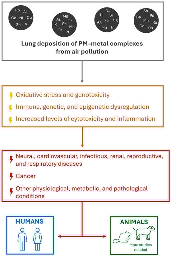 The toxicity of PM derives from multiple associated pollutants, including PAHs and metals []. Prolonged exposure to metal-containing PM can cause severe and varied health problems, being more prominent in highly polluted areas where organisms are continually exposed to these pollutants []. Metal-containing PM may promote genotoxicity [,], immune, genetic, and epigenetic dysregulation [,], and cause increased levels of cytotoxicity, oxidative stress [,], and inflammation [,], which are processes associated with several diseases. A diverse body of evidence shows that exposure to PM–metal complexes is associated with neural, cardiovascular, and respiratory diseases, cancer, renal failure, reproductive abnormalities, among other pathological conditions [,,,,,,,,]. Moreover, a set of studies from our group suggests that exposure to metal pollution can facilitate infections and the spread of pathogens among human and animal populations, as toxic metals such as Pb, Hg, and As harm the immune system and disrupt ecological networks that keep infectious diseases under control [,,]. Figure 2 summarizes the effects of PM–metal complexes on human and animal health.