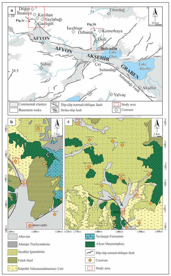 Geological map of the study area: (a) Afyon-Akşehir graben system []; (b) Bolvadin region []; (c) İhsaniye region [,].