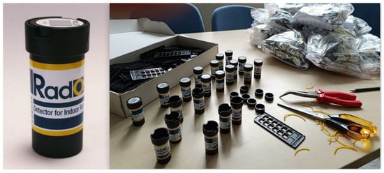 In this study, radon activity concentrations were measured using a passive radon measurement method with the Radosys system and CR-39 detectors obtained from the Turkish Energy, Nuclear, and Mineral Research Agency (TENMAK, Ankara, Türkiye). The system comprises CR-39 solid-state nuclear track detectors (SSNTDs), a bath unit for the chemical treatment of the detectors, and a computer-aided optical reader for trace counting. The most widely used method for determining indoor radon concentrations is alpha particle counting with nuclear track detectors. Figure 2 shows the CR-39 detectors and the removal of their covers after collection from residential homes.