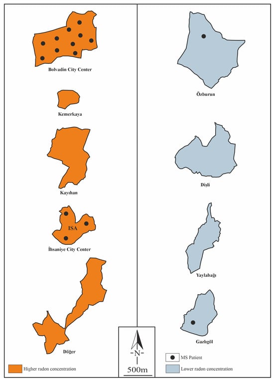 In the study area, the minimum radon concentration was 12 Bq/m3 in the Gazlıgöl region. The radon concentrations in other locations were as follows: İhsaniye city center, 1878 Bq/m3; Kayıhan, 1688 Bq/m3; Kemerkaya, 1603 Bq/m3; and Bolvadin city center, 1325 Bq/m3 (Table 1). On the basis of the ICRP reference radon value of 300 Bq/m3 [], the regions were grouped into higher and lower radon areas, as shown in Figure 3. The İhsaniye city center, Kayıhan, Kemerkaya, Döğer, and Bolvadin city center were classified as higher radon regions, whereas Dişli, Yaylabağı, Gazlıgöl, and Özburun were identified as lower radon regions.