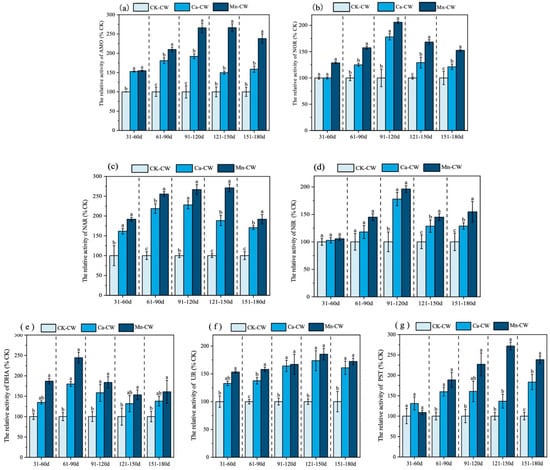 Relative activity of substrate enzymes in CWs exposed to PS NPs. (a) AMO, (b) NOR, (c) NAR, (d) NIR, (e) DHA, (f) UR, and (g) PST devices with different labeling letters indicate significant differences (p < 0.05).