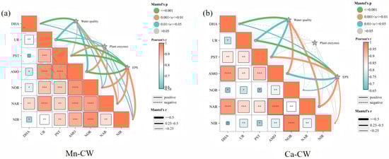 Based on previous studies, substrate enzyme activities were analyzed alongside water quality parameters, plant characteristics, and extracellular polymeric substance (EPS) content using a Mantel analysis. This analysis was conducted for both Mn-CW and Ca-CW treatment groups, using CK-CW as the control. Figure 3 illustrates the correlations between substrate enzyme activities and various characteristics of the constructed wetland systems. In constructed wetlands, water quality indicators and substrate enzyme activities form a dynamic, interactive “drive–feedback” mechanism: enzymes catalyze pollutant transformations that directly improve water quality, while shifts in water quality, in turn, regulate enzymatic activity []. The average COD and TN removal rates in Mn-CW and Ca-CW were improved by 14.15–18.88% and 13–19%, respectively, compared to the control group (CK-CW), while high TP removal efficiency was also maintained, achieving optimal phosphorus elimination. Furthermore, both systems significantly enhanced the transformation of NO2−-N, NO3−-N, and NH4+-N, sustaining efficient coupled nitrification–denitrification processes [].