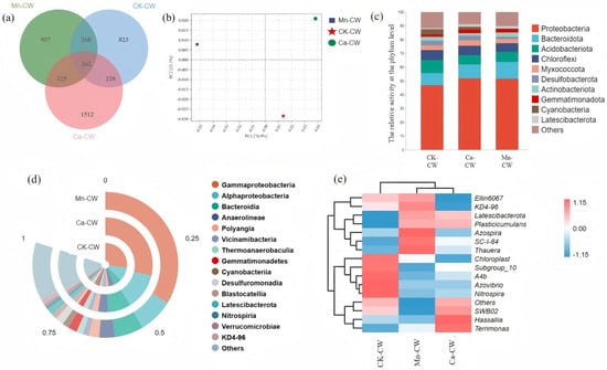 The Venn diagram provides a visual representation of differences in microbial community composition among the wetland groups (Figure 4a). A total of 4247 OTUs were identified across all samples, with only 362 OTUs (8.52%) shared among the three groups, indicating substantial variation in microbial community structures. Additionally, Ca-CW and CK-CW shared 268 OTUs (6.31% of the total), while Mn-CW and CK-CW shared 220 OTUs (5.18%), suggesting that both Mn-MBF and Ca-MBF bio-nests altered microbial structural composition, with the Mn-MBF treatment inducing more pronounced changes. Principal Component Analysis (PCA) was employed to assess the differences and relative distances in microbial composition between samples. In PCA plots, closer sample clustering indicates higher similarity in microbial community structure. As shown in Figure 4b, CK-CW was positioned farther from both Mn-CW and Ca-CW, confirming that MBF bio-nest incorporation significantly altered microbial community composition. Furthermore, the greater separation between Mn-CW and Ca-CW suggests that the two modification strategies exerted distinct influences on microbial structural composition.