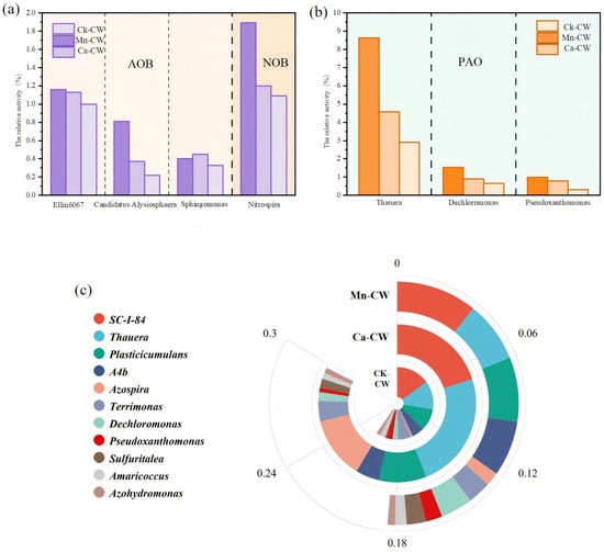 Histogram of relative abundance of nitrifying functional bacteria and polyphosphate bacteria (a) nitrifying bacteria, (b) polyphosphate bacteria, and (c) differences in the distribution of denitrifying functional bacteria in each group.