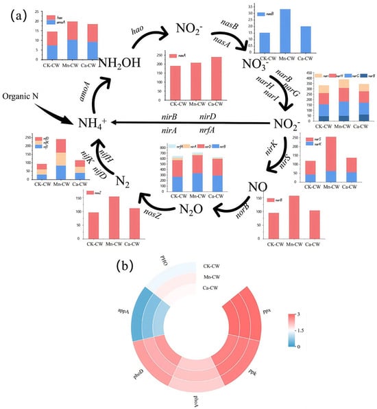 The nitrification process primarily involves the sequential conversion of NH4+ to NH2OH, NH2OH to NO2−, and NO2− to NO3−, catalyzed by enzymes encoded by amoA, hao, nasA, and nasB. As shown in Figure 6a, the abundances of amoA and hao were elevated in Mn-CW and Ca-CW compared with CK-CW, suggesting that the addition of MBF bio-nests enhanced ammonia oxidation and NH2OH oxidation. The nasB gene abundance in Mn-CW increased by 116.20% and 64.00% compared with CK-CW and Ca-CW, respectively, indicating that Mn-MBF bio-nests may specifically promote nasB expression. Conversely, nasA abundance in Ca-CW increased by 25.92% compared with CK-CW and by 15.19% compared with Mn-CW, implying that Ca-MBF bio-nests might favor the expression of the nasA gene. Overall, the combined abundances of nasA and nasB in Mn-CW and Ca-CW were higher than in CK-CW, indicating that MBF bio-nests facilitated the oxidation of nitrosative nitrogen to nitrate, thereby promoting nitrification.