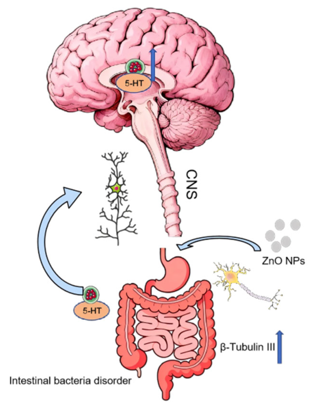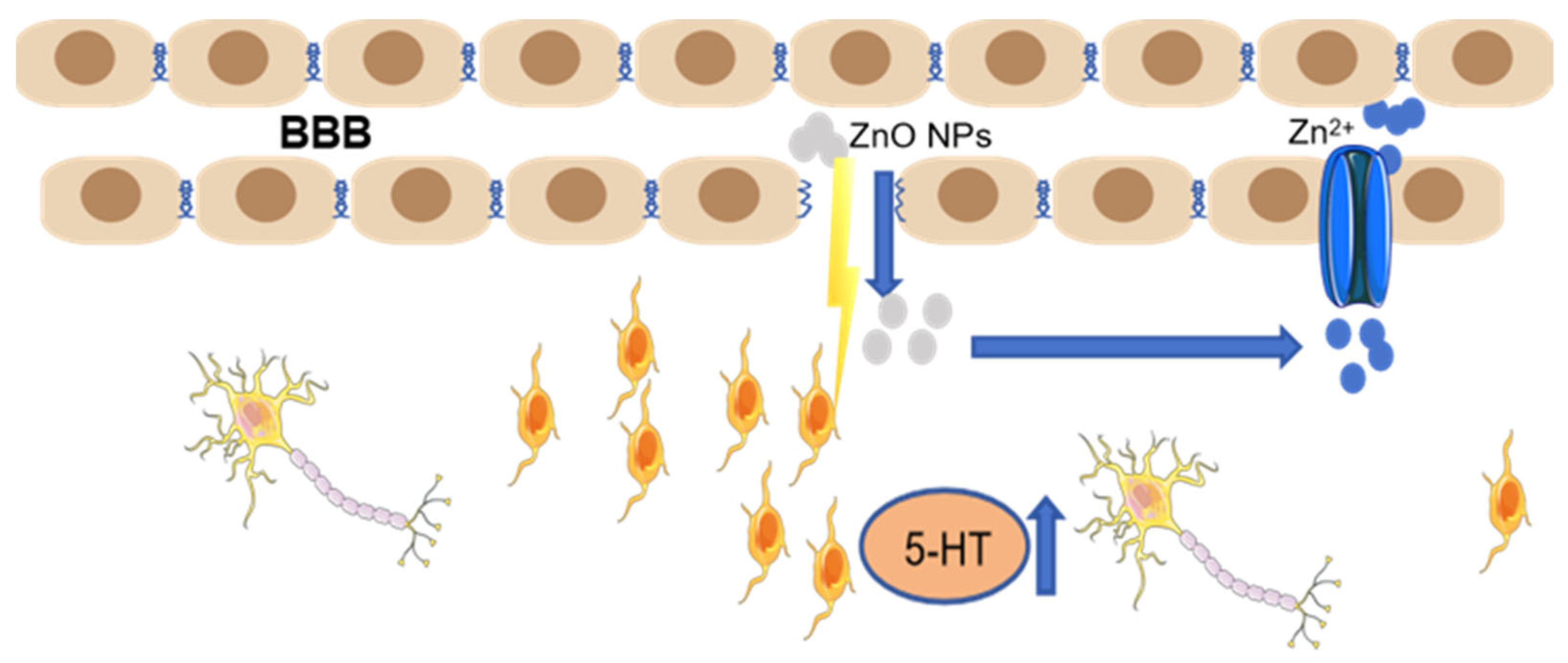 - Zhang, S.S.; Cheng, S.Q.; Jiang, X.J.; Zhang, J.; Bai, L.L.; Qin, X.; Zou, Z.; Chen, C.Z. Gut-brain communication in hyperfunction of 5-hydroxytryptamine induced by oral zinc oxide nanoparticles exposure in young mice. Food Chem. Toxicol. 2020, 135, 110906. [Google Scholar] [CrossRef]