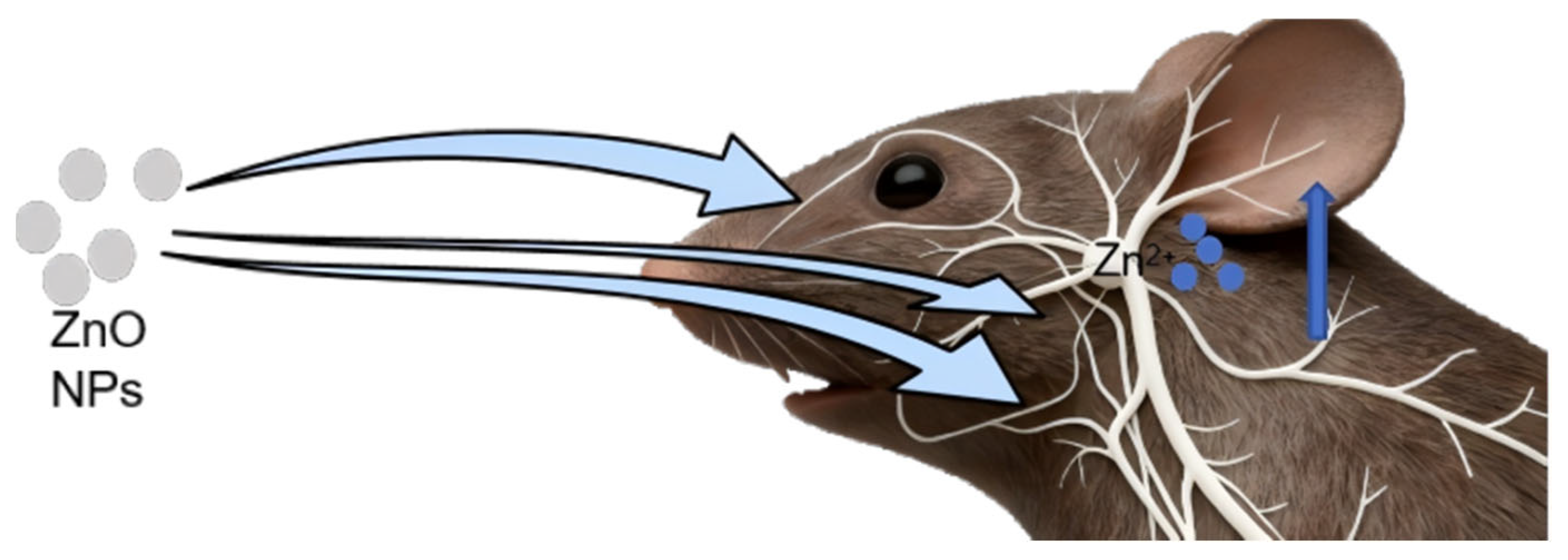 - Guo, Z.L.; Zhang, P.; Luo, Y.L.; Xie, H.D.Q.H.; Chakraborty, S.; Monikh, F.A.; Bu, L.J.; Liu, Y.Y.; Ma, Y.C.; Zhang, Z.Y.; et al. Intranasal exposure to ZnO nanoparticles induces alterations in cholinergic neurotransmission in rat brain. Nano Today 2020, 35, 100977. [Google Scholar] [CrossRef]