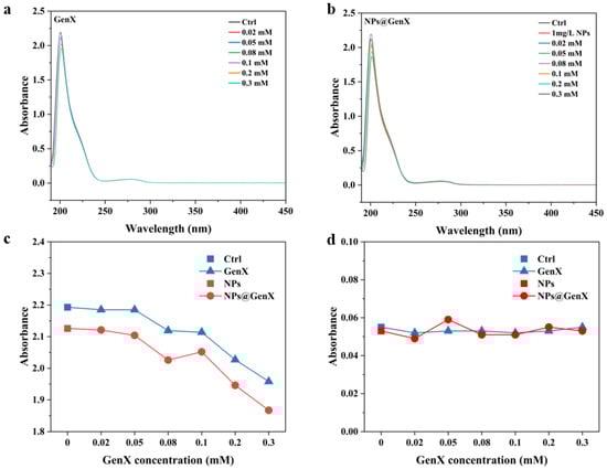 Changes in UV-Vis absorption spectra of HSA induced by (a) GenX, (b) NPs@GenX, (c) peak spectrum at 200 nm, and (d) peak spectrum at 280 nm.