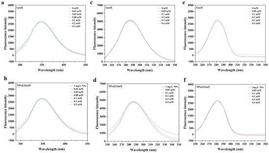Fluorescence spectroscopy is used to investigate the changes in fluorescent amino acid residues [38], which in turn reflect alterations in the overall protein structure. In HSA, the intrinsic fluorescence primarily originates from the tryptophan (Trp) residue [39]. Prior to the formal experiments, a preliminary test was conducted in Figure 2, which revealed that the difference in absorption values of GenX at the excitation and emission peak wavelengths was less than 5% [40]. Therefore, the inner filter effect could be considered negligible. As shown in Figure 2a,b, neither NPs nor GenX alone induced significant changes in the fluorescence intensity, and their combination also showed no notable effect, indicating that neither GenX nor NPs substantially influenced the chromophore environment of HSA.