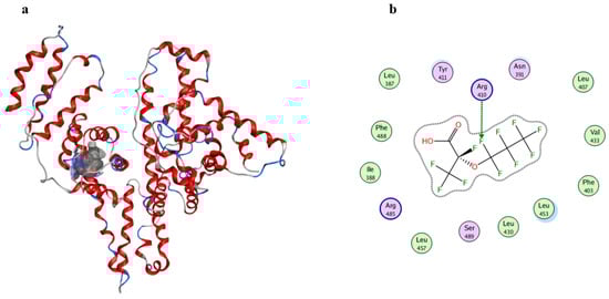 Molecular docking was performed with Molecular Operating Environment (MOE) 2014 Edition(Chemical Computing Group Inc., Montreal, QC, Canada) to investigate the binding modes of GenX complexes with HSA [27,28]. The HSA crystal structure (PDB: 1AO6) was acquired from the RCSB Protein Data Bank, and ligand structures were sourced from ChemicalBook. The protein was prepared by removing water molecules and adding hydrogen atoms. Potential binding sites were identified by the Site Finder tool, and interactions with amino acids were analyzed using MOE-Dock simulations.