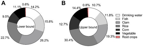 The pie charts illustrate the relative contributions of different dietary and drinking water pathways to iAs exposure among residents of Batangas (Figure 2). Under the LB scenario (Figure 2A), clams represented the largest contributor to total iAs dose (26.2%), followed by rice (22.7%), fish (15.8%), drinking water (14.2%), vegetables (11.1%), corn (9.5%), and root crops (0.6%). Under the UB scenario (Figure 2B), rice became the dominant contributor (30.4%), followed by clams (19.3%), vegetables (14.4%), corn (12.7%), fish (11.8%), drinking water (10.7%), and root crops (0.8%). Across both scenarios, aquatic foods (fish and clams) accounted for approximately 31–42% of total iAs intake, while terrestrial crops (rice, corn, vegetables, and root crops) contributed 44–58%. These results indicate that dietary sources, particularly rice and aquatic foods, remain the primary exposure pathways for residents of Batangas.