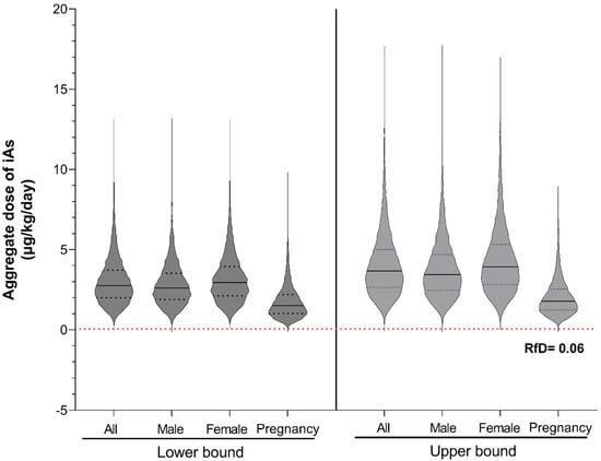 Distribution of simulated iAs dose under lower- and upper-bound exposure scenarios. Violin plots show the distribution of daily iAs doses (µg/kg-day) for the total population (All) and subgroups (Male, Female, Pregnancy). The left and right panels represent lower-bound and upper-bound scenarios, respectively. The black line denotes the median, while the black dash lines represent the interquartile range. The red dashed line indicates the U.S. EPA oral reference dose (RfD) for iAs (0.06 µg/kg-day).