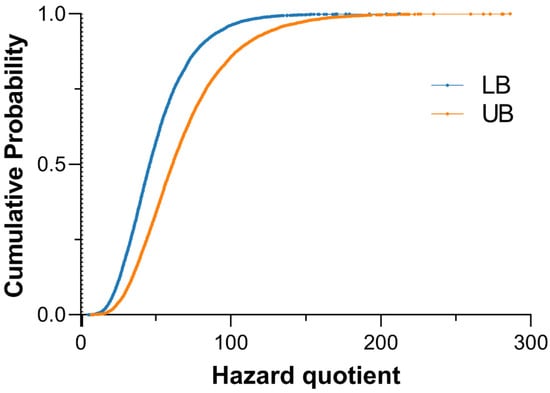 All simulated individuals exhibited HQs greater than 1 under both LB and UB exposure scenarios, indicating potential concern for non-cancer health effects associated with iAs exposure (Figure 5). The maximum HQs reached 212.8 in the LB scenario and 286.1 in the UB scenario, showing that combined dietary and drinking water exposures substantially exceeded the U.S. EPA reference dose (0.06 μg/kg/day).