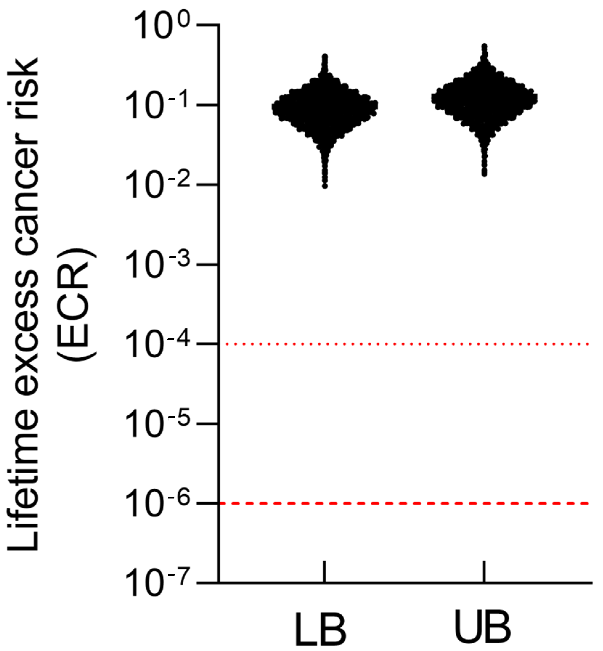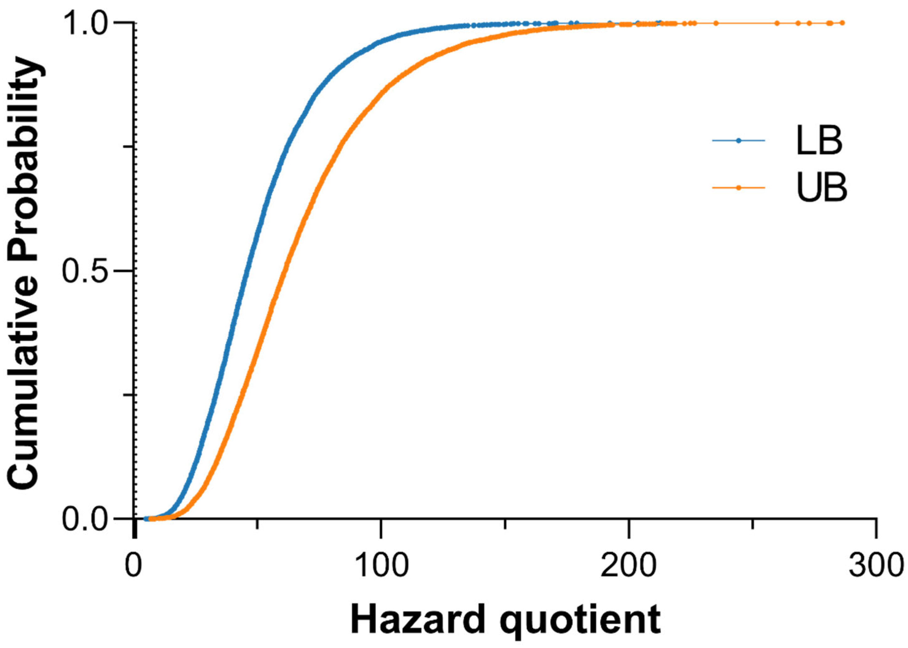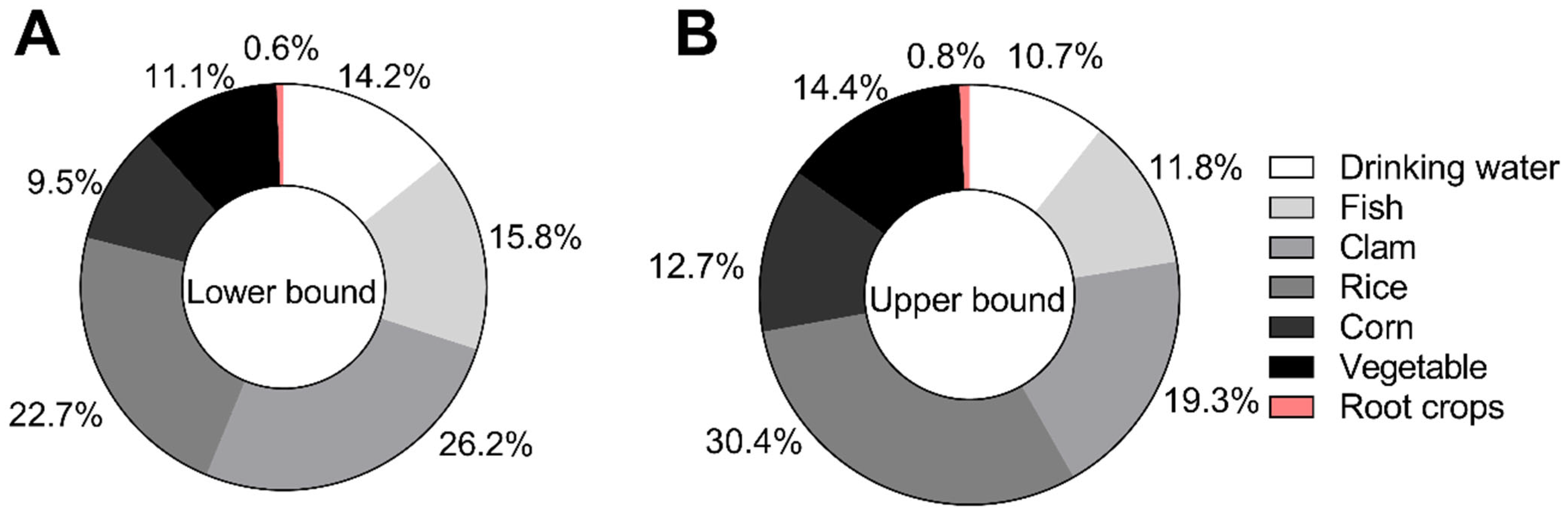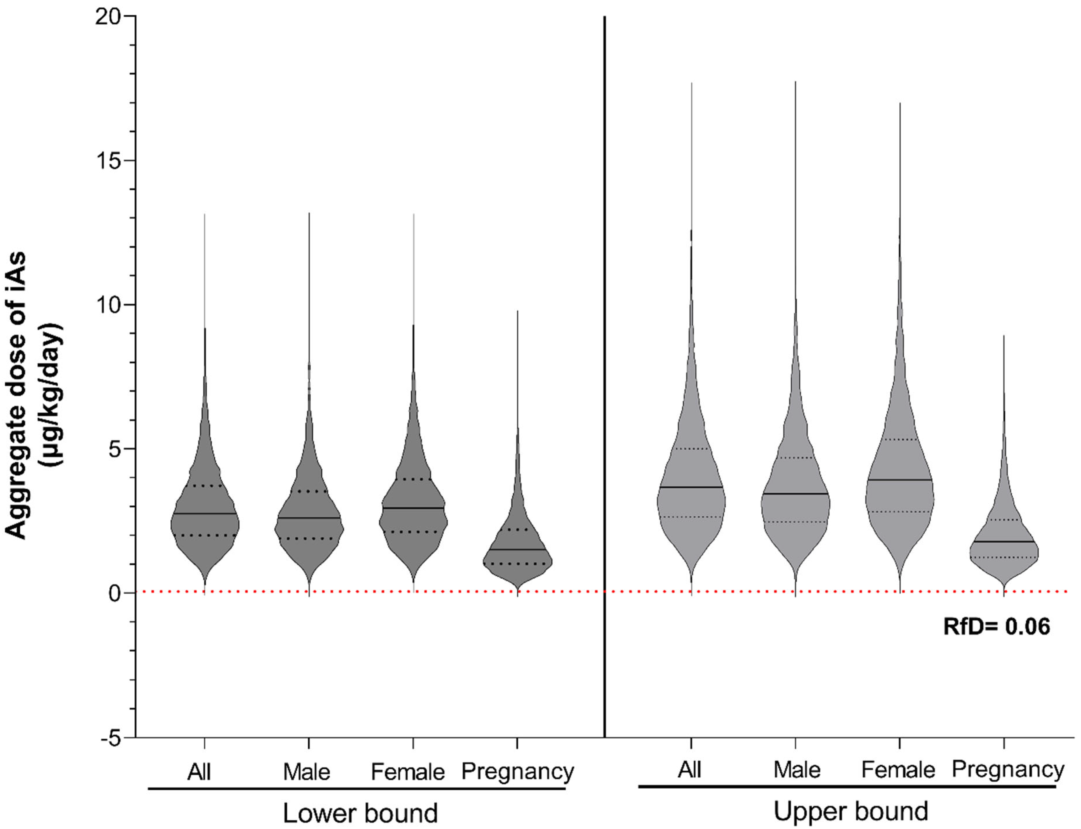 3.3. Aggregate Dose of iAs Under Lower- and Upper-Bound Exposure Scenarios for Residents in Batangas, Philippines