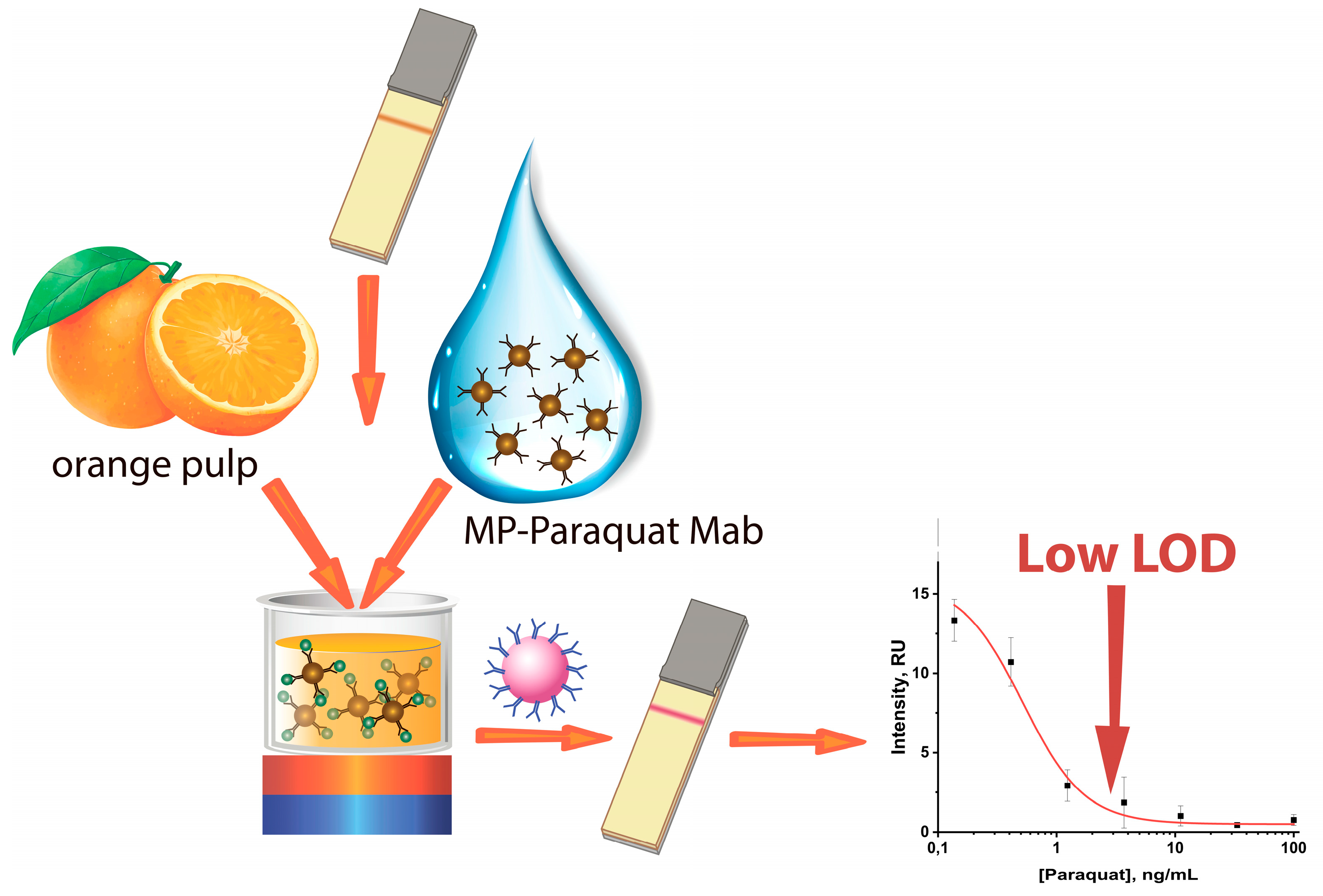 - Jara, M.D.L.; Alvarez, L.A.C.; Campos, F.V.; Antunes, P.W.P.; Guimarães, M.C.C.; de Oliveira, J.P. Development of a competitive lateral flow assay for rapid paraquat detection. Food Anal. Methods 2024, 17, 284–295. [Google Scholar] [CrossRef]